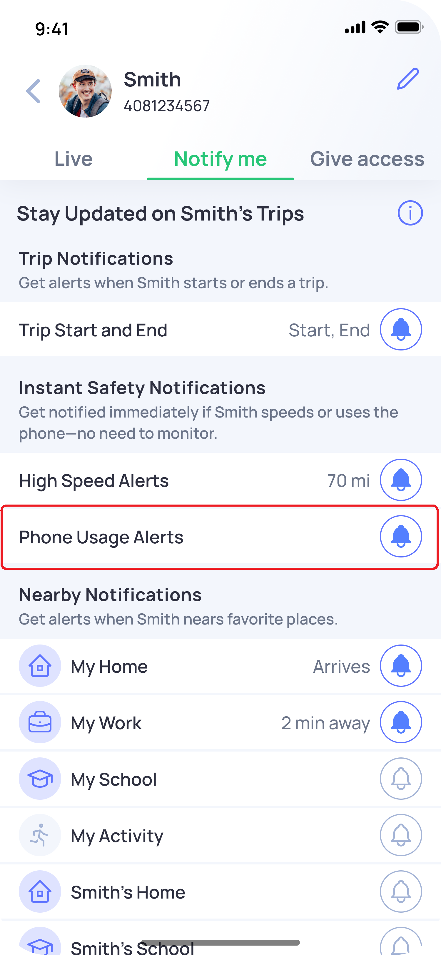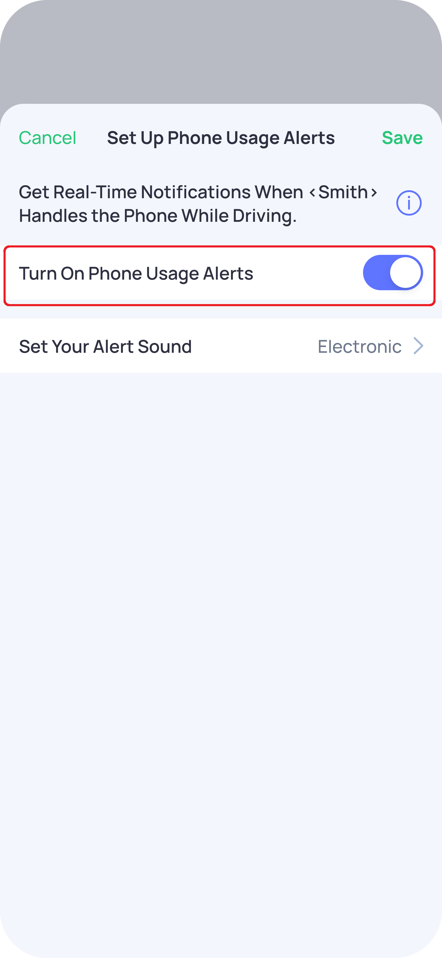 - Select Phone Usage Alerts and turn ON/OFF the toggle button.