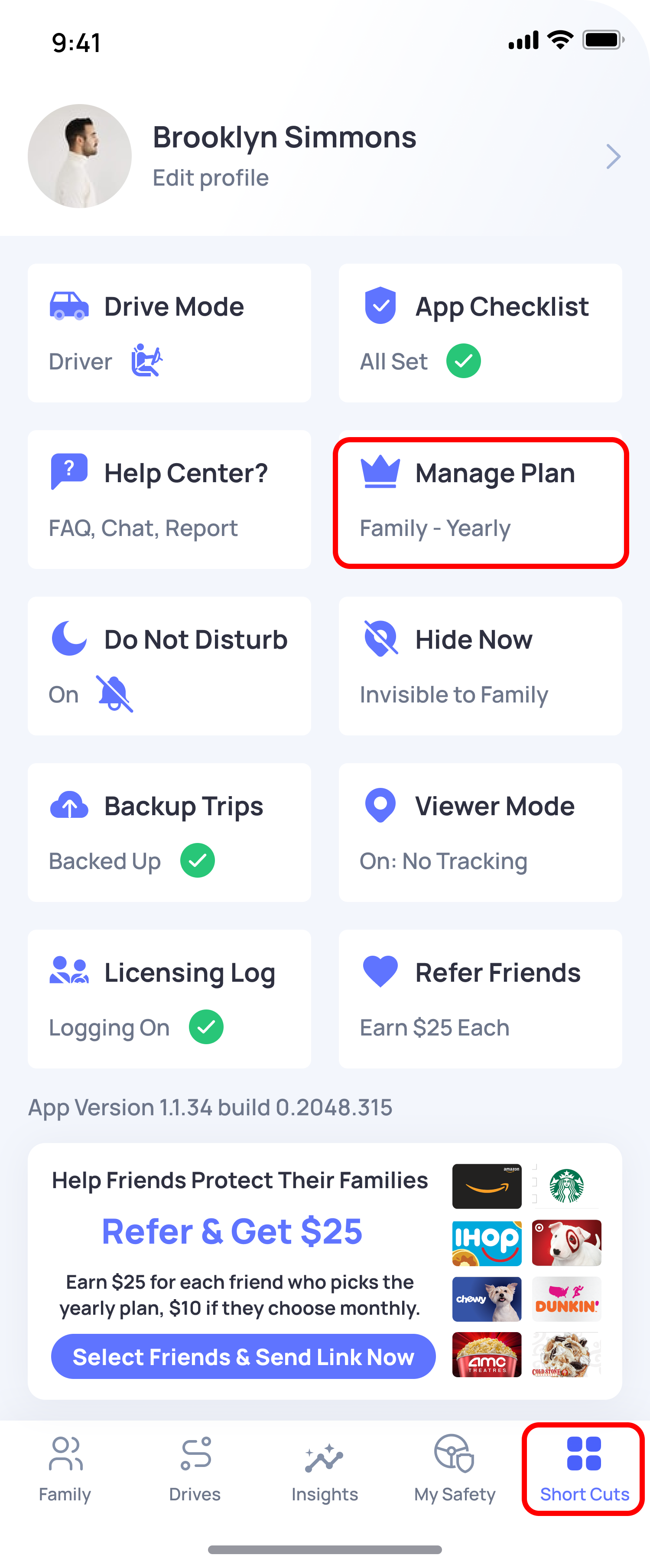 - Access the Short Cuts menu and select the Manage Your Plan option.
